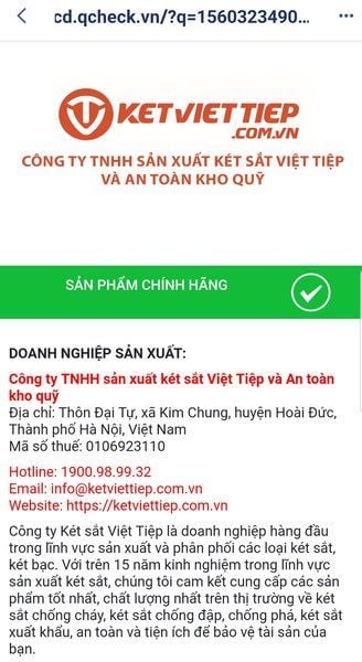 Với tất cả những kết quả khác khi check đều cho thấy mẫu két sắt Việt Tiệp mà bạn mua không phải là sản phẩm của công ty TNHH sản xuất két sắt Việt Tiệp và An toàn kho quỹ.