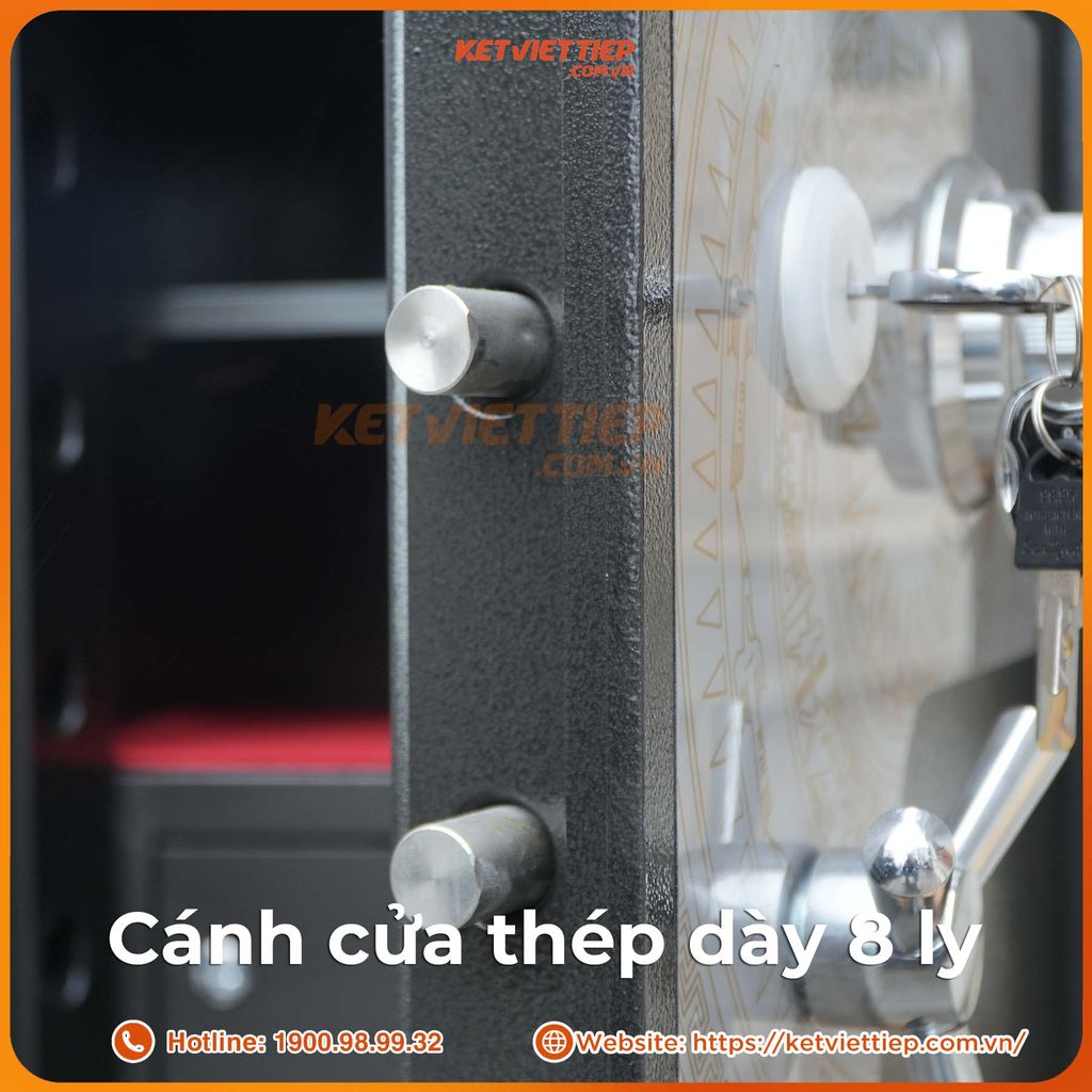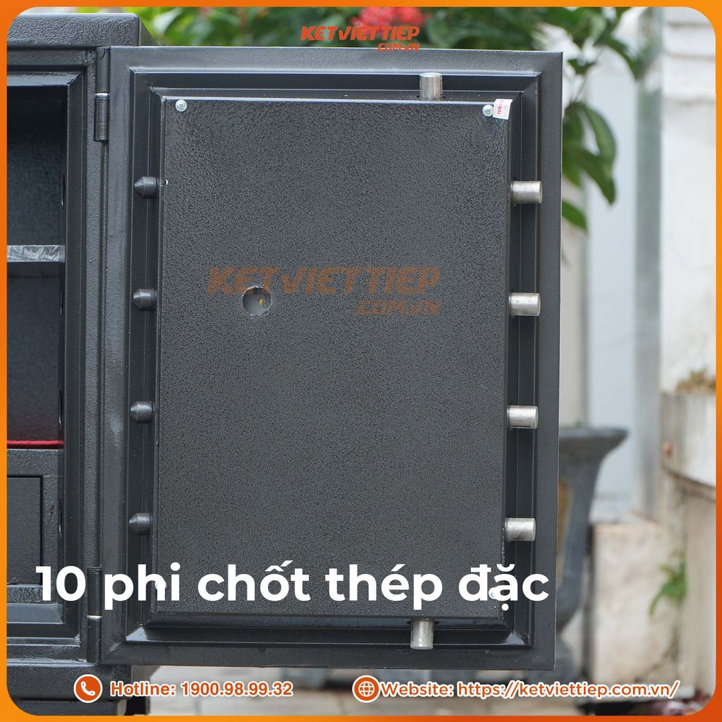 Két sắt có 8 chốt khóa đúc đặc ăn sâu vào trong lòng két sắt khi đóng cánh cửa lại và 2 bản lề nổi chống khoan cắt