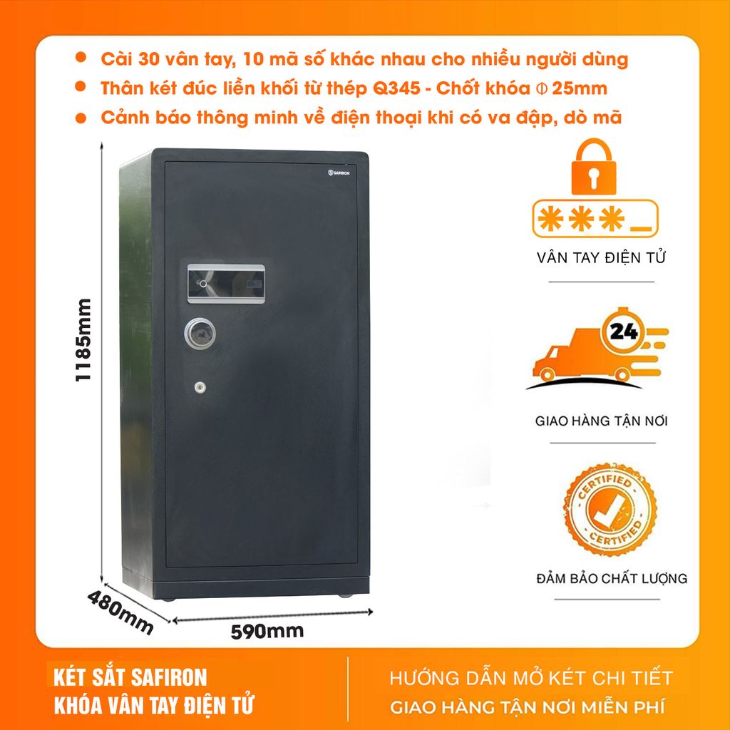 Két sắt nhập khẩu Safiron 120LS khóa vân tay điện tử – thép Q345 liền khối, cảnh báo điện thoại thông minh