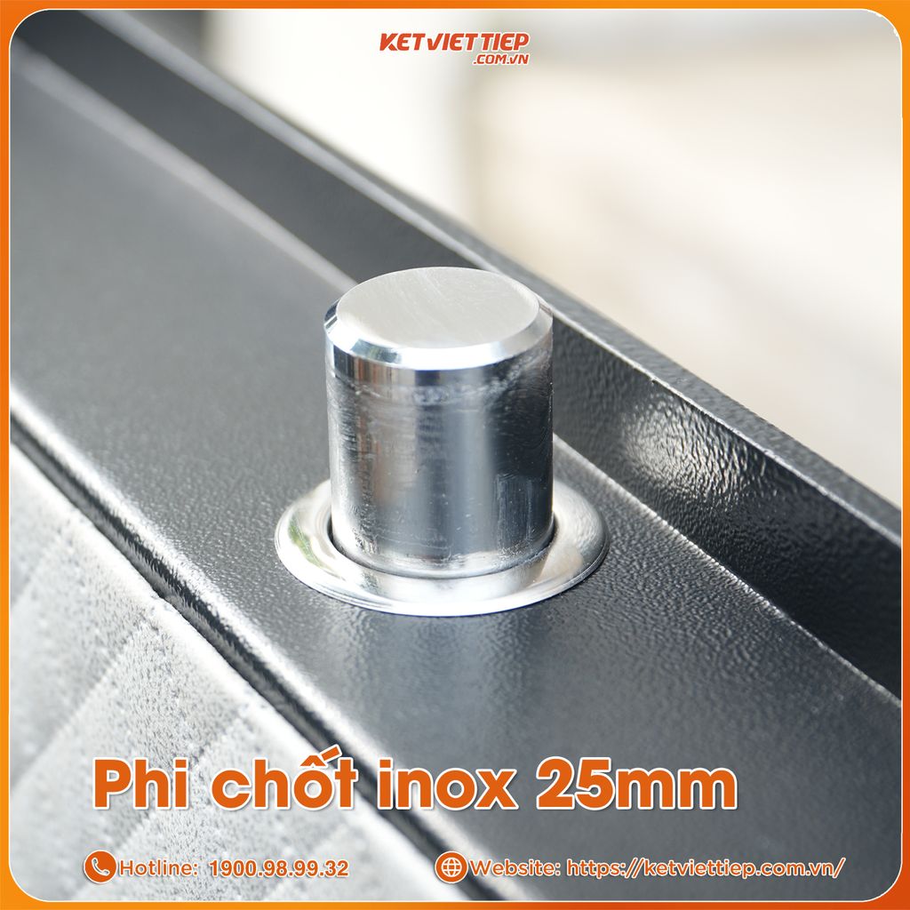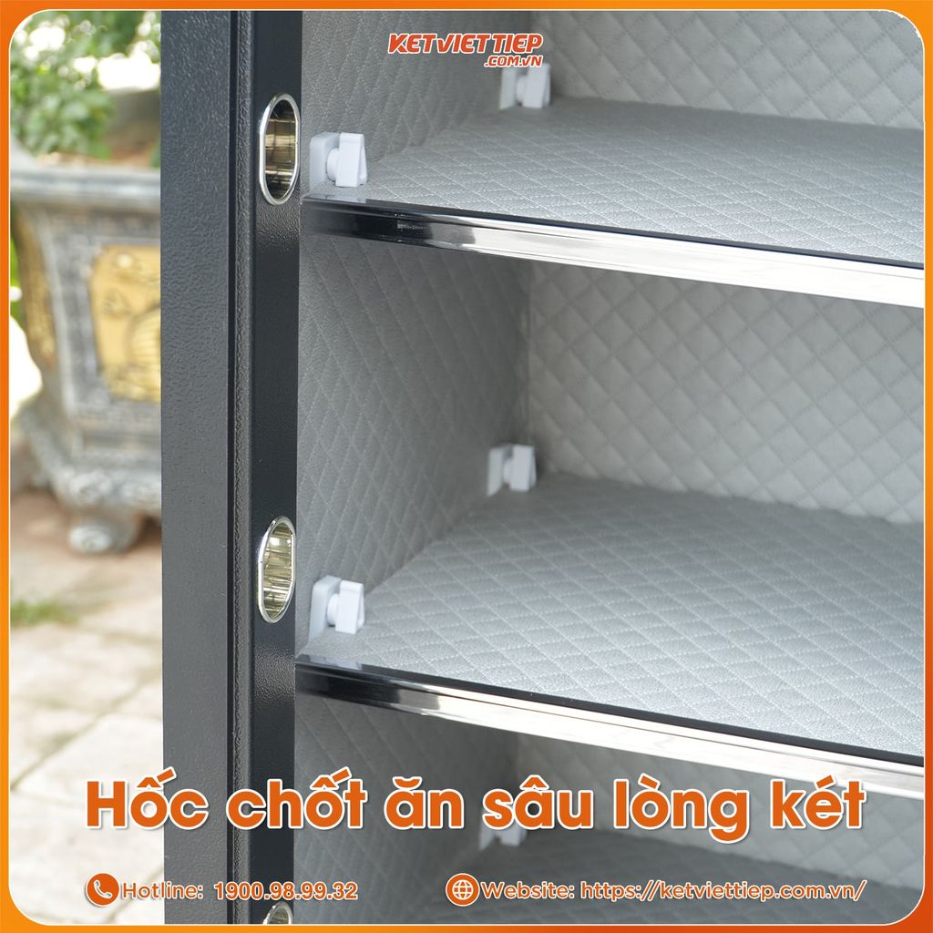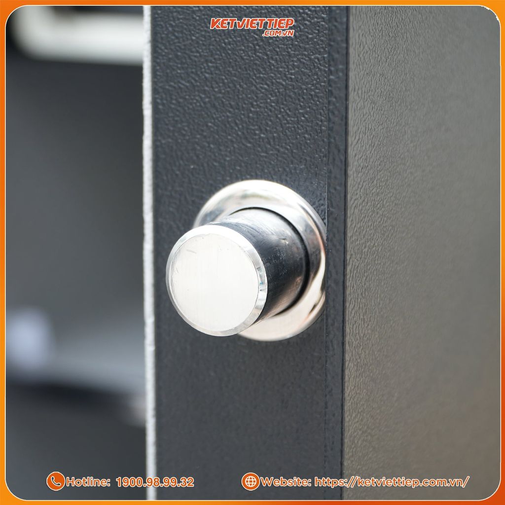 Chốt khóa: Trang bị 6 chốt Inox đúc đặc, ăn sâu 3 chiều vào thân két – chống nạy, chống khoan, chống phá tuyệt đối. Mỗi chốt khóa hoạt động độc lập, đảm bảo an toàn tuyệt đối cho mọi tài sản bên trong.