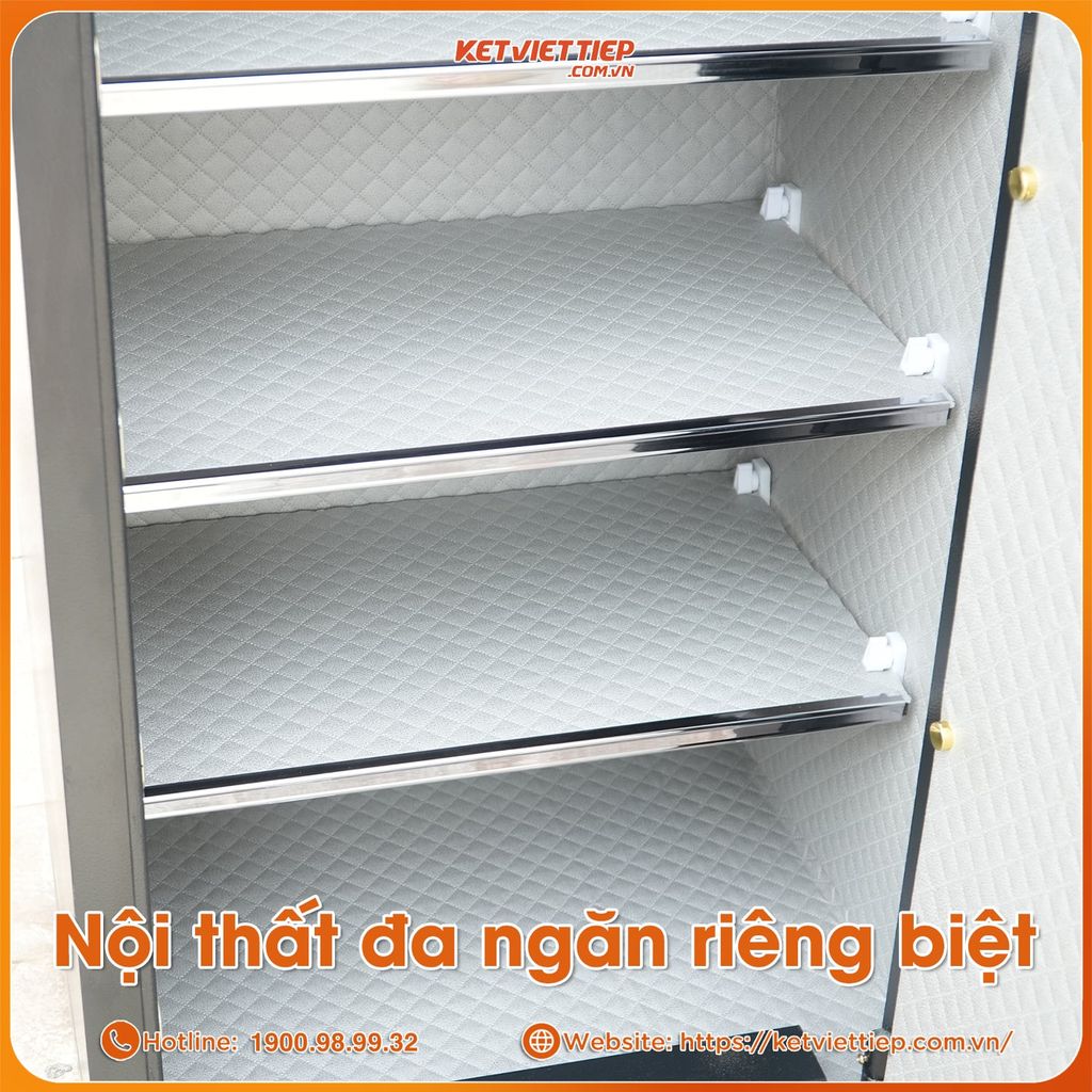 Nội thất: Bọc nỉ kim cương cao cấp, chia ngăn tiện lợi, có ngăn kéo riêng, giúp chống trầy xước và bảo vệ trang sức, giấy tờ, vàng bạc tinh tế, sang trọng.