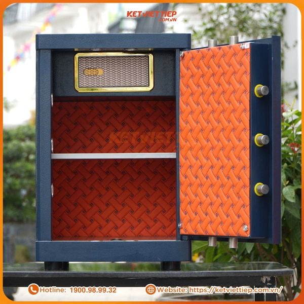 Bên trong két được trang bị lớp bọc da cao cấp, không chỉ bảo vệ các vật dụng quý giá khỏi xước hay hư hại mà còn tăng thêm vẻ đẹp sang trọng cho không gian nội thất của két. Ngăn kéo bảo mật với khóa mã điện tử là giải pháp lưu trữ lý tưởng cho những tài sản đặc biệt cần bảo mật cao, đồng thời cung cấp không gian rộng rãi, phù hợp để giữ giấy tờ, hồ sơ một cách thoải mái và ngăn nắp.