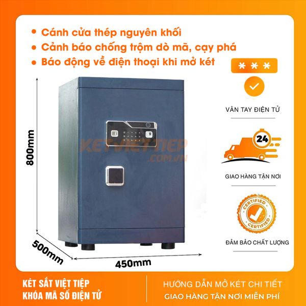 - Bảo mật: Hệ thống bảo mật kép kết hợp vân tay và điện tử thông minh, cảnh báo đóng mở két sắt qua điện thoại