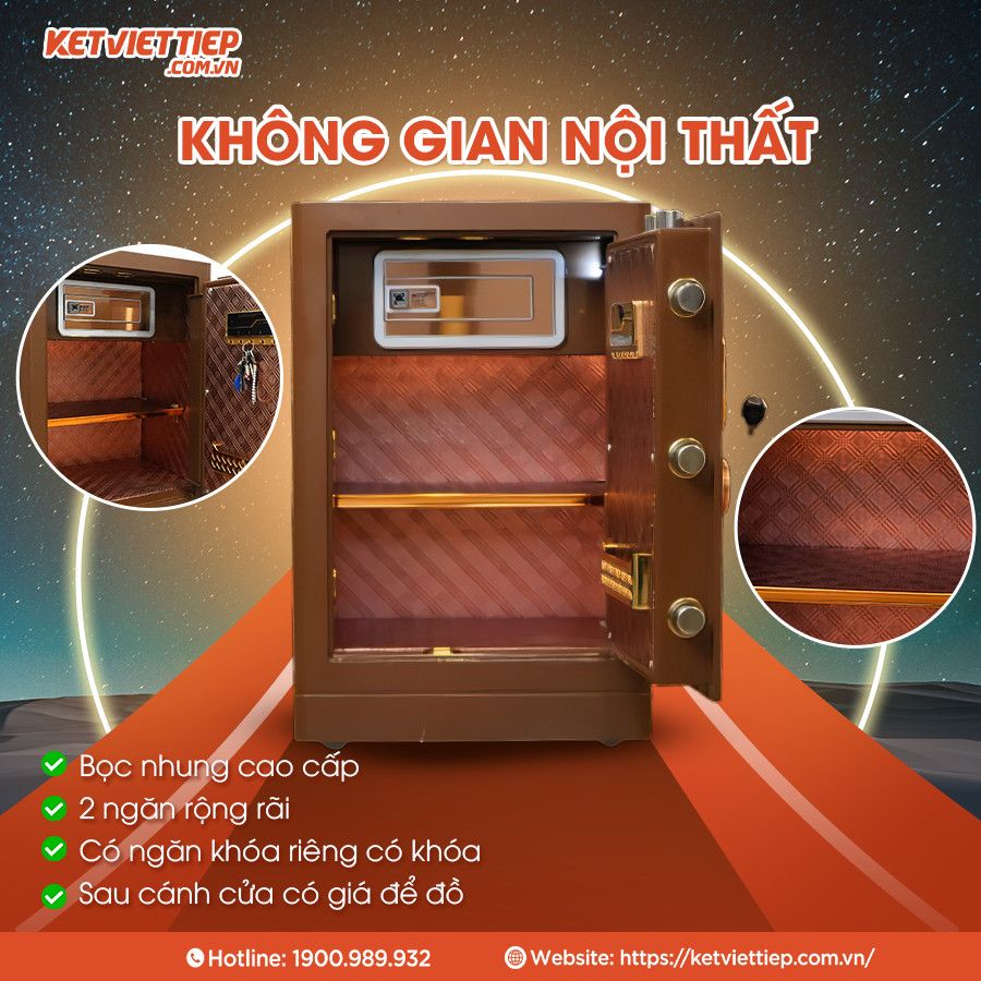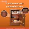 - Thiết kế khoa học: Phần lòng két được chia thành 3 ngăn riêng biệt trong đó có 1 ngăn khóa phụ với hệ thống khóa riêng. Điều này giúp chiếc két có thêm không gian bề mặt để sử dụng, trưng bày, sắp xếp tài sản gon gàng, không bị bừa bộn, thất lạc.