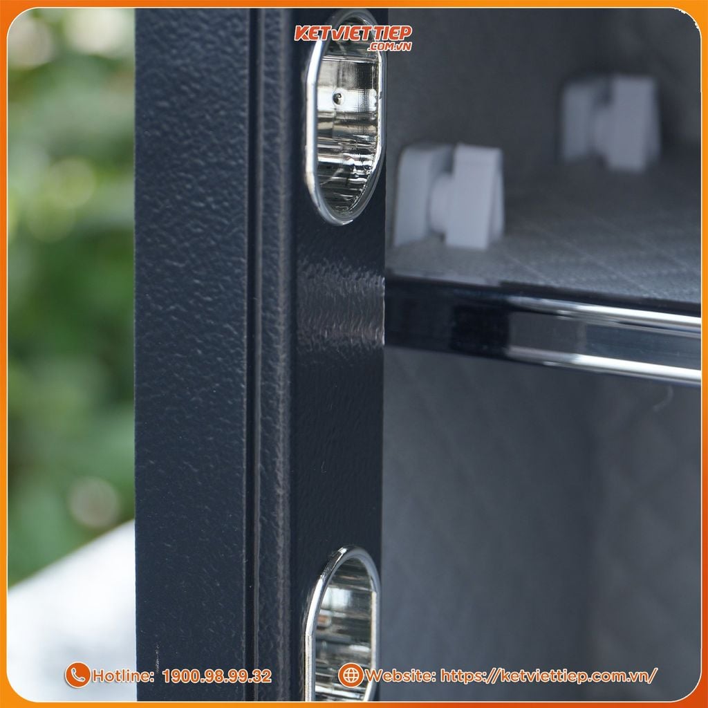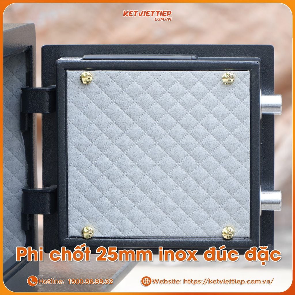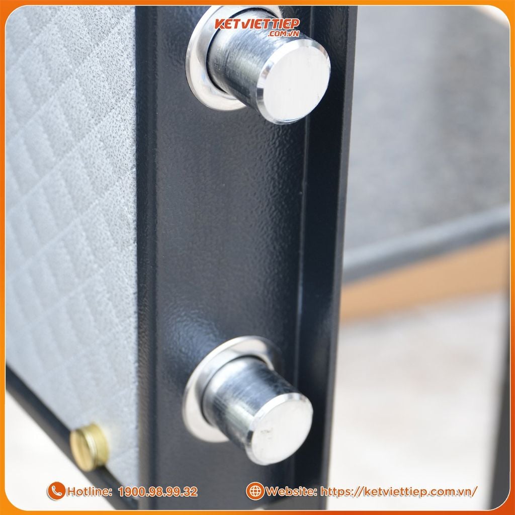 Hai chốt khóa inox phi 25mm đúc đặc, ăn sâu vào lòng thân két, mạ Crom sáng bóng chống gỉ sét – khóa chặt, chống cạy phá gần như tuyệt đối, giữ an toàn cho mọi tài sản giá trị.