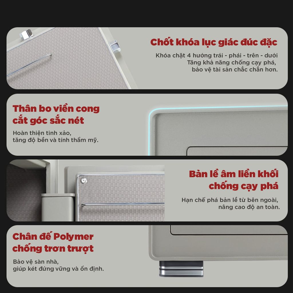• Hệ thống khóa: Cảm biến sinh trắc học bán dẫn + Mã số điện tử bảo mật cao + Chìa khóa cơ giải cứu sử dụng trong trường hợp khẩn cấp. Mặt khóa hợp kim chống phá, chống trầy xước, chống bám dấu vân tay.