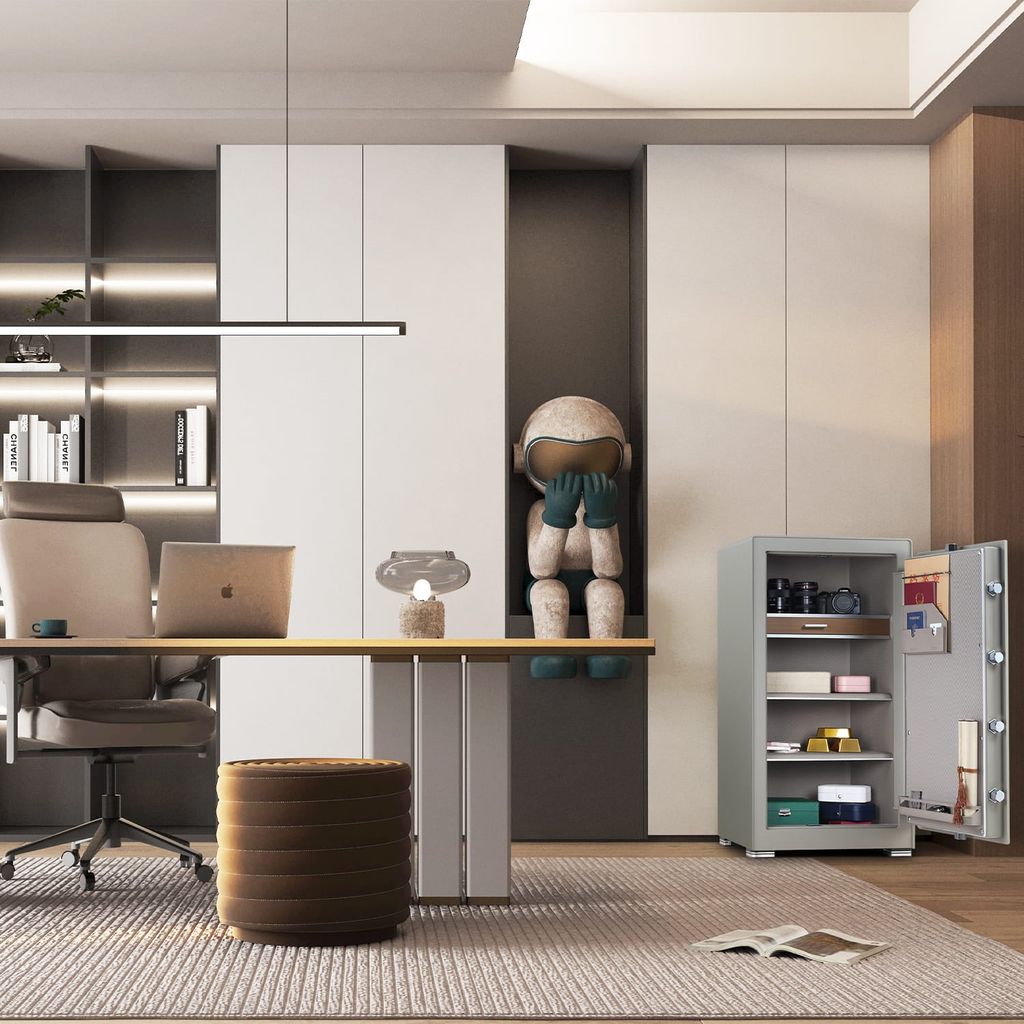 Cánh cửa tích hợp khay đựng hộ chiếu, tài liệu và phong bì quan trọng, tối ưu không gian sử dụng. Tổng thể nội thất mang phong cách hiện đại, tinh tế như một tủ bảo quản tài sản cao cấp, vừa đảm bảo an toàn vừa nâng tầm thẩm mỹ cho không gian sống.