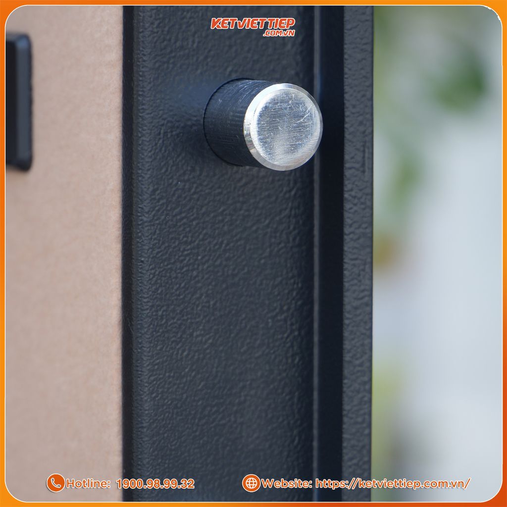 Hệ thống chốt khóa inox phi 25mm mạ Crom sáng bóng: Ba chốt tròn đặc ăn sâu vào lòng thân két, khóa chặt 3 chiều, chống nạy cửa và khoan phá gần như không thể.