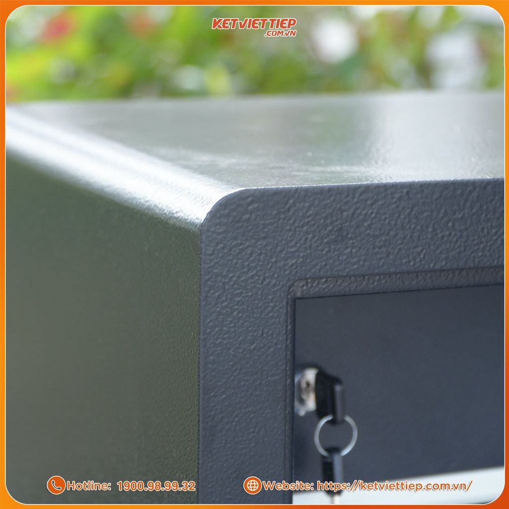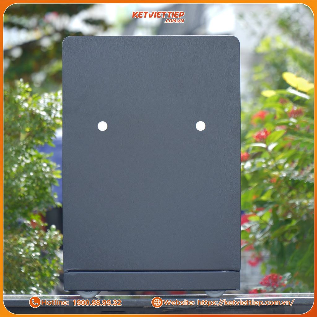 Bề mặt phủ sơn tĩnh điện, chống trầy, chống ẩm, chống oxi hóa, giúp két luôn như mới sau nhiều năm sử dụng.Hệ thống cố định kép an toàn: 2 lỗ bắt vít âm phía sau, cho phép cố định két chắc chắn vào tường hoặc thành tủ.