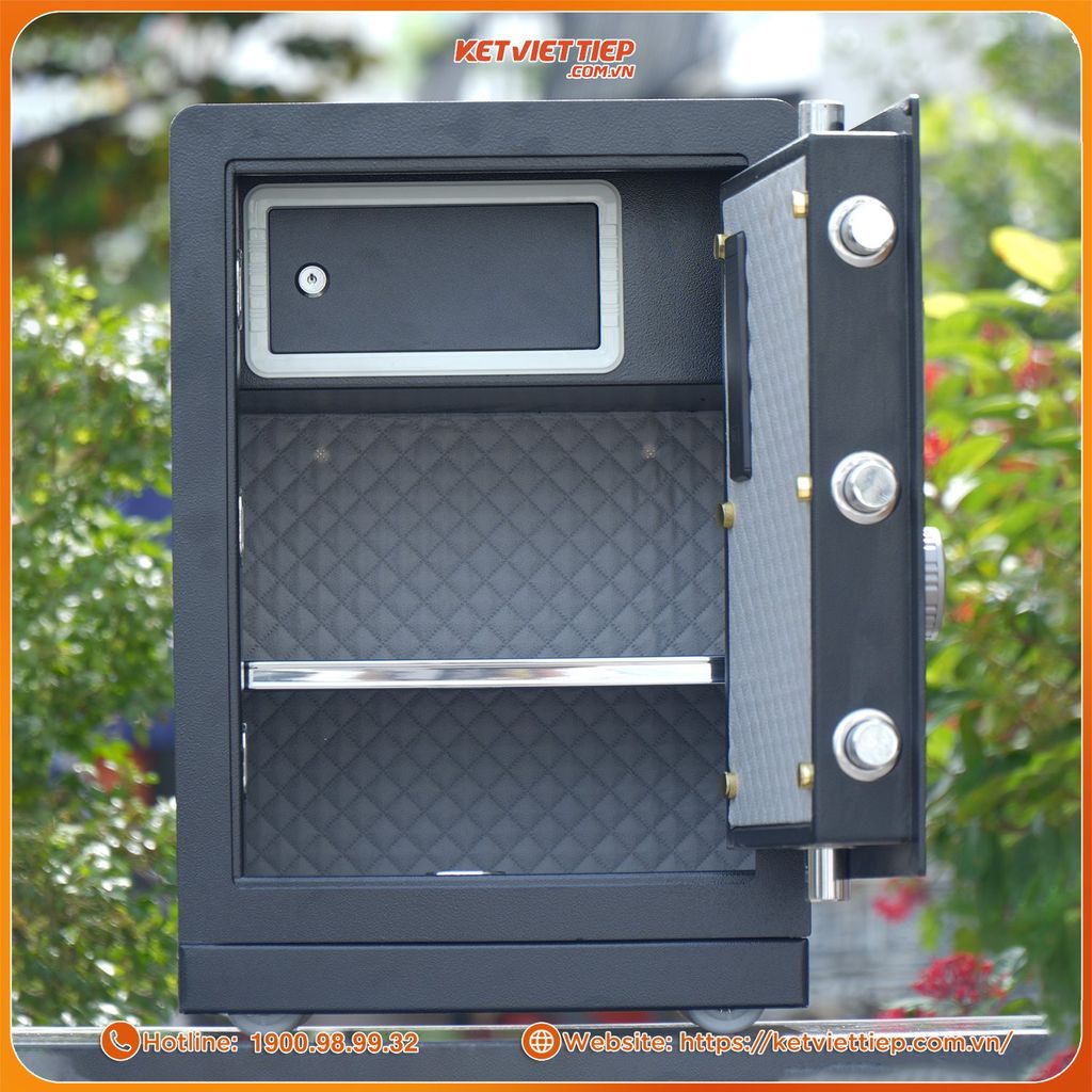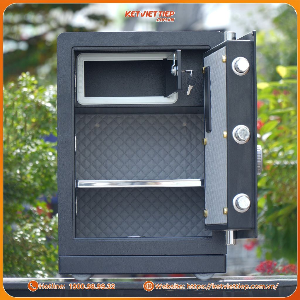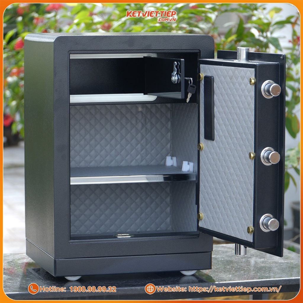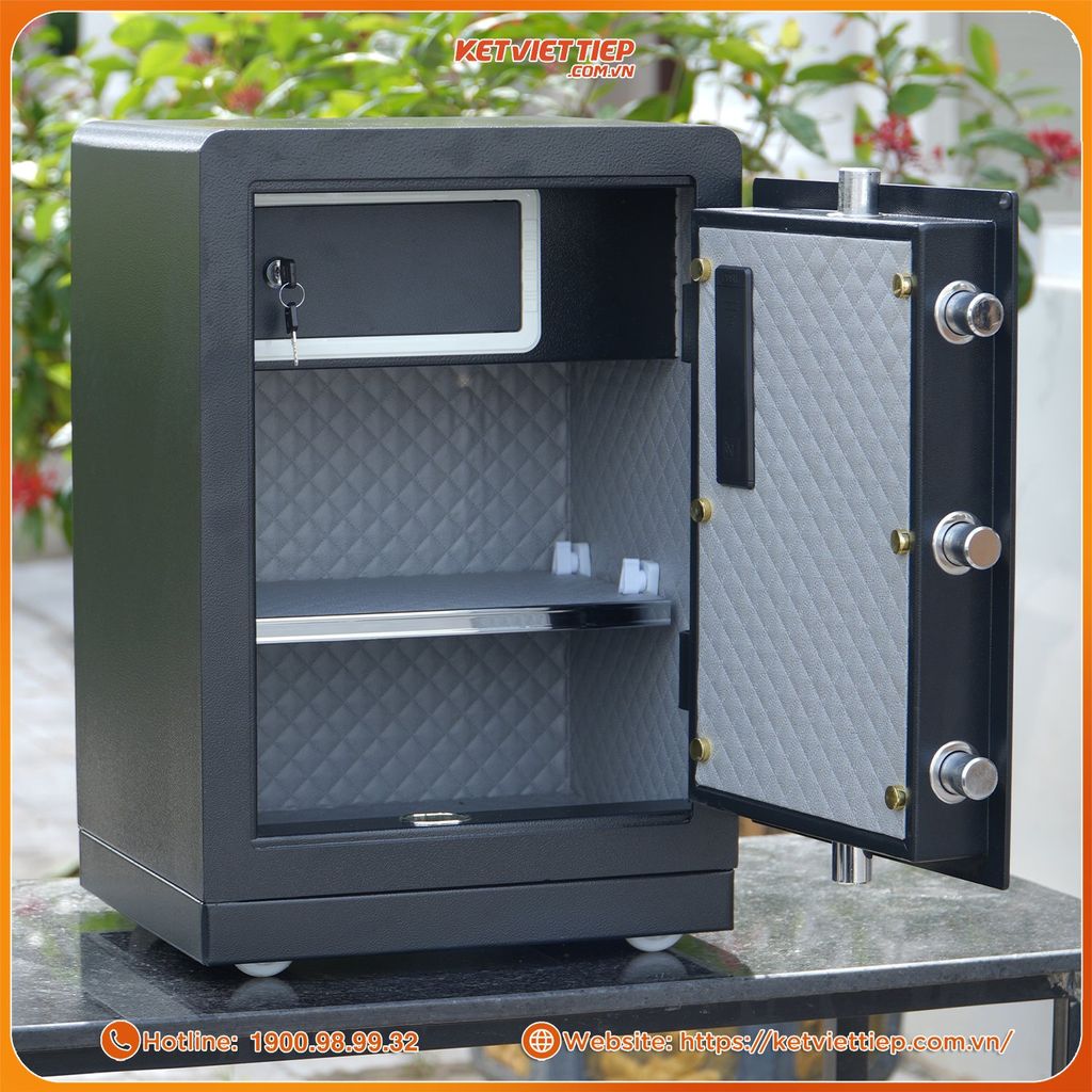 Ba ngăn chứa rộng rãi, ngăn trên có khóa riêng: Giúp phân chia tài sản rõ ràng – giấy tờ, vàng, tiền mặt, trang sức, laptop – tất cả đều có vị trí riêng.