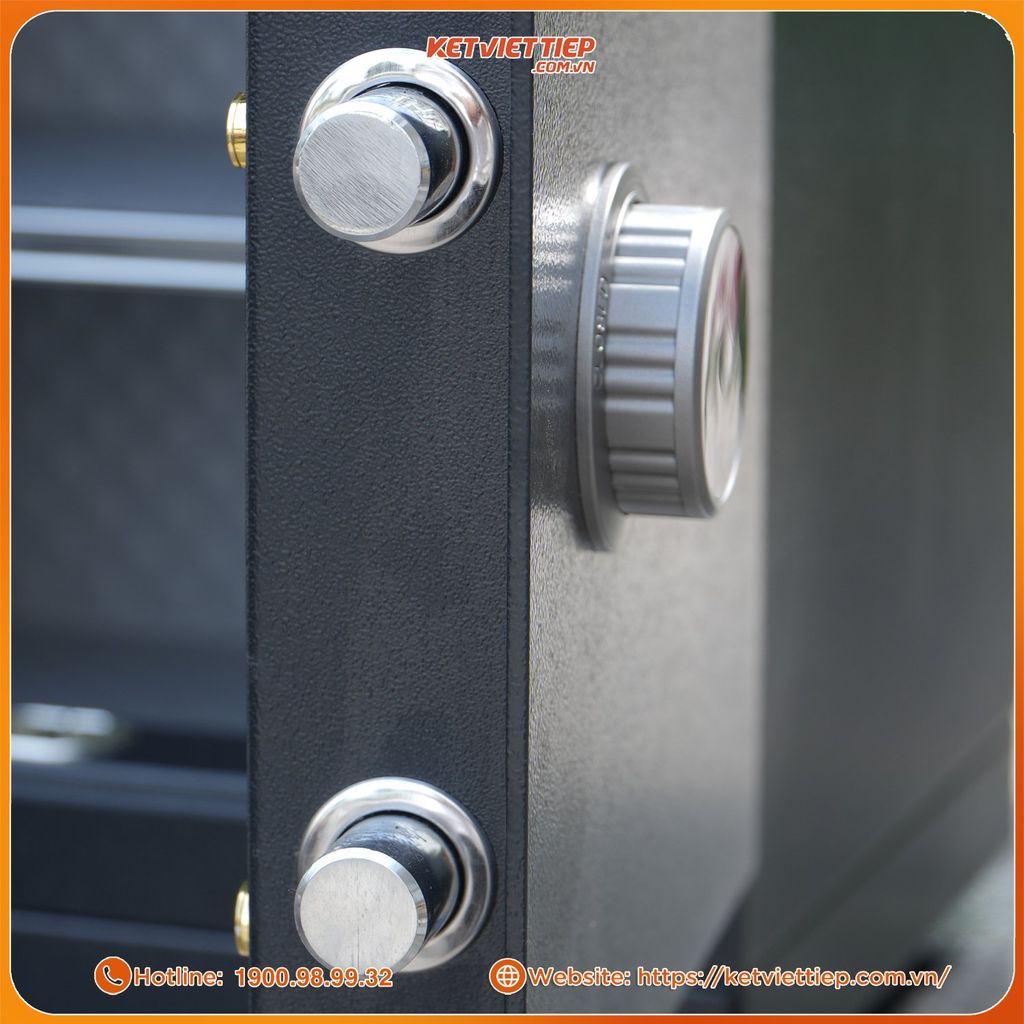 Năm chốt khóa inox φ25mm đúc đặc: Ăn sâu vào thân két, mạ Crom sáng bóng, chống gỉ và chống khoan phá.