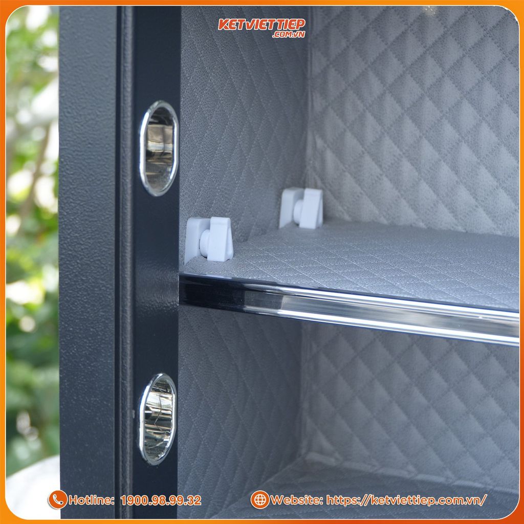 → Một chạm mở két – nhanh, chính xác và đẳng cấp như mở cửa siêu xe.Nội thất bọc da kim cương cao cấp: Toàn bộ bên trong được lót da mềm màu xám sang trọng, chống trầy xước và tạo cảm giác tinh tế mỗi khi mở két.