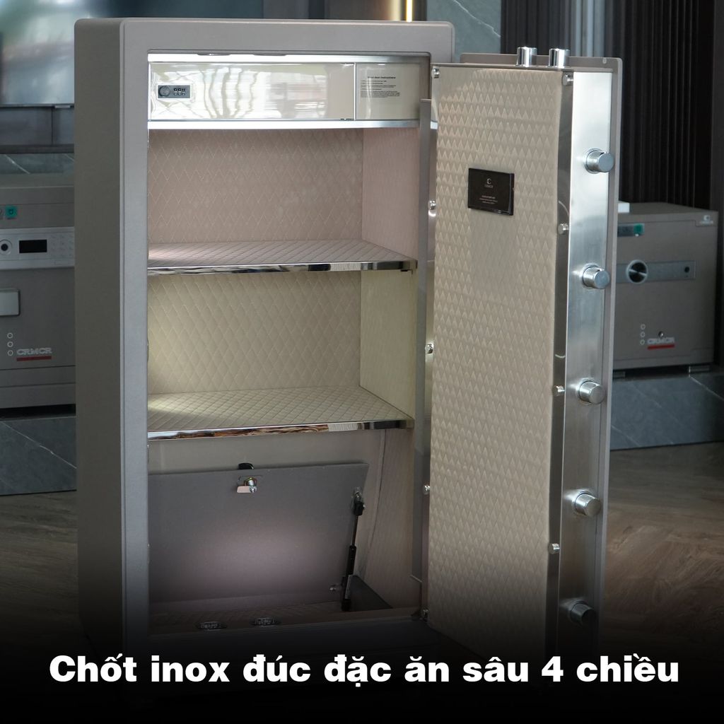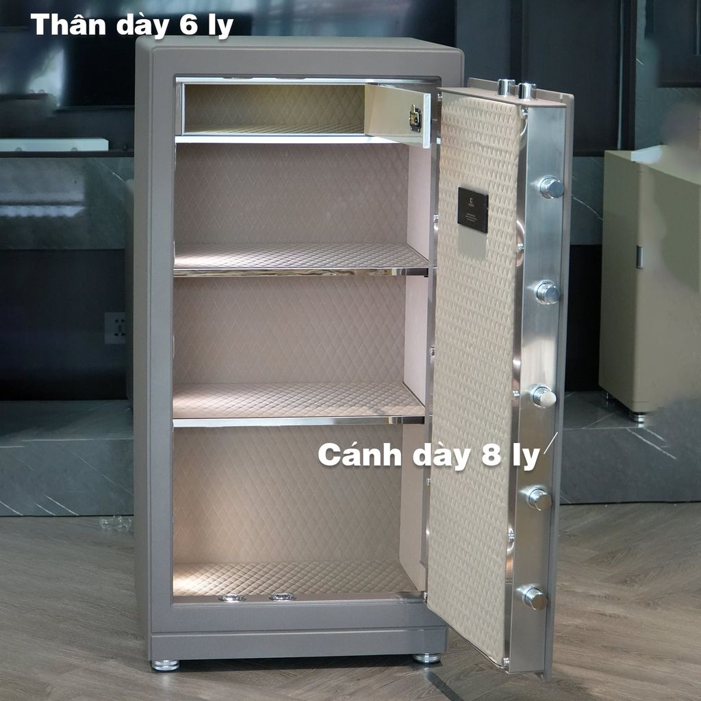 - Nội thất bên trong: Bọc da cao cấp, trần vân kim cương; bố trí 3 ngăn lớn đựng tiền mặt – hồ sơ – giấy tờ; 1 ngăn kéo phụ có khóa riêng sử dụng mã số độc lập cho phép cài đặt và đổi mã từ 000–999; 1 ngăn hầm bí mật ẩn kín có khóa riêng để cất giữ tài sản giá trị cao