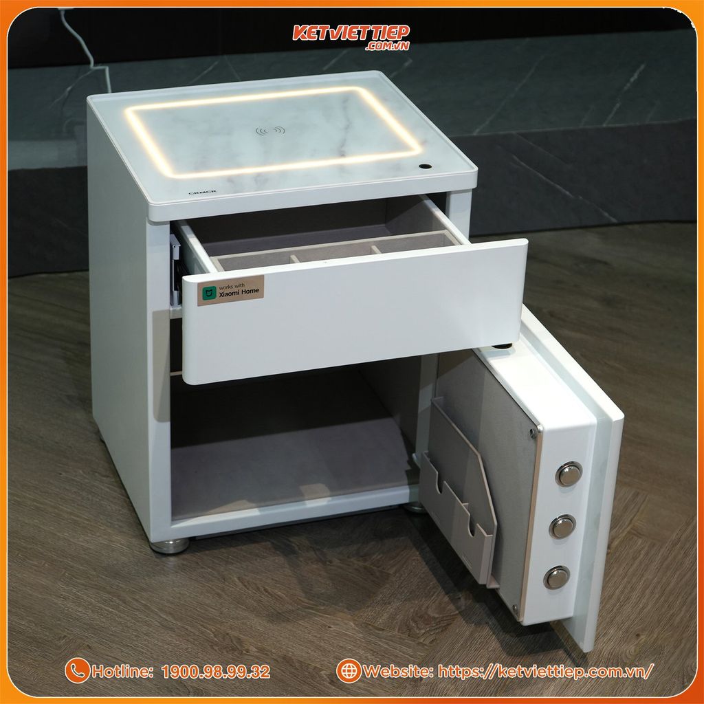 Két sắt Xiaomi CRMCR 50YN không đơn thuần là két sắt, mà là một món nội thất thông minh. Bề mặt phủ giả đá marble cao cấp, ánh sáng đèn LED dịu nhẹ tự động bật lên mỗi khi vào phòng, khay trên có thể đặt đèn ngủ hoặc sạc điện thoại không dây. Khi đóng lại, két trông như một chiếc tủ đầu giường hiện đại – vừa tinh tế, vừa kín đáo, đảm bảo an toàn mà không ai nhận ra.