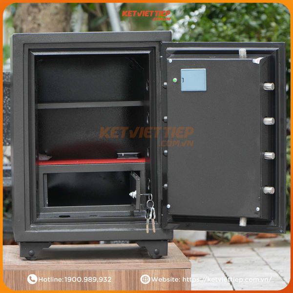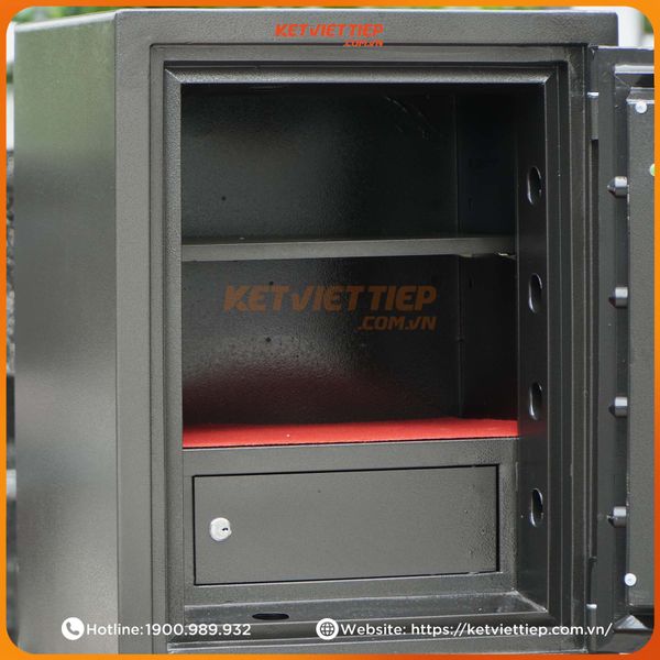 - Trong lòng két được trang bị 1 hộp ngăn kéo có khóa chìa riếng biệt và 1 khay di động giúp khách hàng phân chia diện tích sử dụng trong lòng két sắt phù hợp.