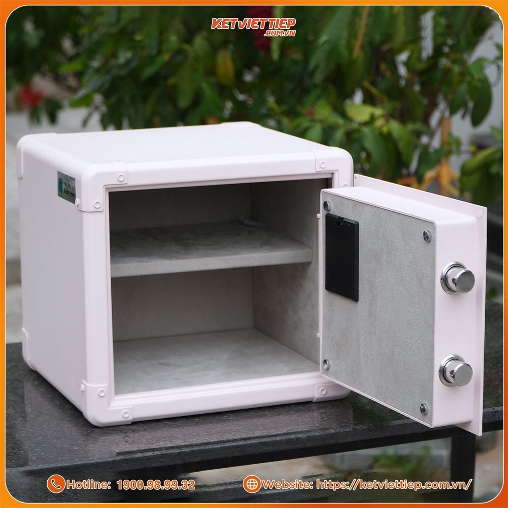 Cánh thép: Thép dày nguyên tấm dày 5mm; bên trong tích hợp 2 chốt khóa đặc bằng thép nguyên khối ăn sâu vào thân két, giữ chặt tuyệt đối khi đóng.